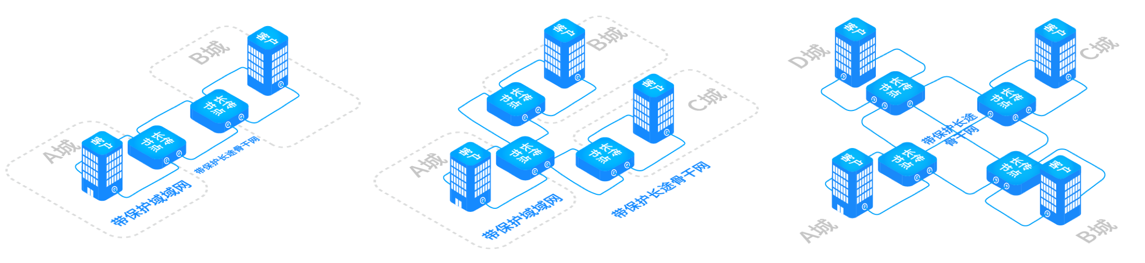 •客户A城、B城的公司/数据中心通过带保护城域网、带保护长途骨干网直接相连,内网直通通讯